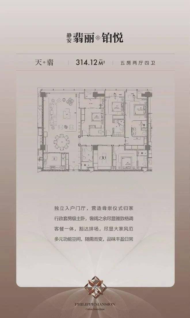 - 天翡314㎡:5房2厅4卫,独立入户门厅+行政级主卧套房,客餐一体设计彰显大宅风范。