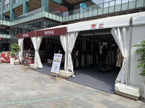 零售品牌部分则较为杂乱,除了荟品仓、宝岛眼镜、华为,其他多为服饰工厂店以及特卖店,店铺内未进行精装修,招牌也少有见,广场中庭还有一个搭建的“无印良品”简易棚,国际知名品牌暂处于空缺中,快时尚、国内一二线服饰鞋靴等品牌也未有见。