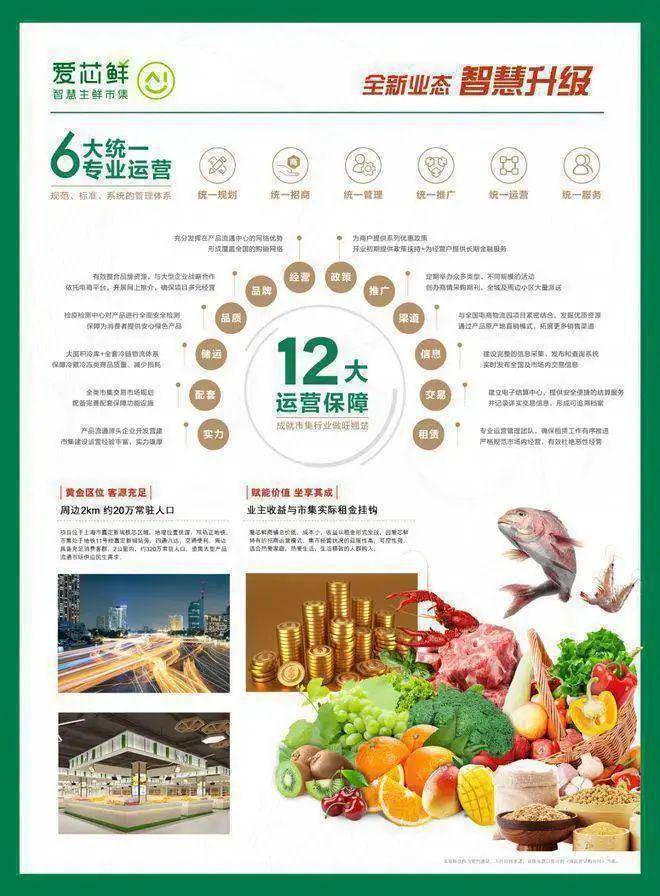 业态分布:鲜花水果;熟食;美食加工;蔬菜;肉类;光禽,水产;冰鲜;豆制品;特产;粮油米面;小吃;炒货等