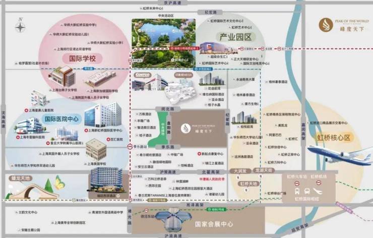 峰度天下位于上海虹桥商务区的南虹桥核心前湾板块,汇集国际高能配套,数字经济,生物医药,文创电竞三大产业布局,国际医学中心配置1个医技中心和7家高端医院,7所国际学校,3大超级商超,京沪高速,北翟高架,崧泽高架,嘉闵高架,沈海高速三横两纵交通路网,虹桥交通枢纽机场,高铁,地铁,公交,城际大巴等立体交通,13号线季乐路站在建(距离仅500米),且有园区巴士早晚高峰直达虹桥高铁站,无限便利。