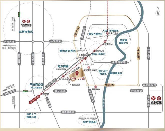 中环高架、沪闵高架、虹梅高架、嘉闵高架、外环高速、沪金高速,驾车约*分钟到达虹桥高铁站,驾车约*分钟到达浦东机场。