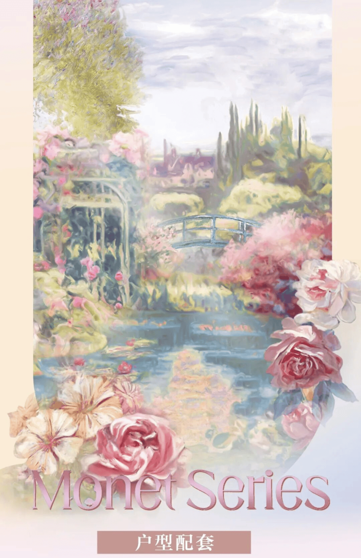 将印象派的光色逻辑注入居家空间。以低饱和粉绿、暖米白为主调,既有光影的流动,也有温柔的模糊。