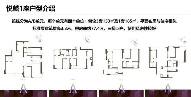1.TODTOWN天荟 | 悦麟分为两个单元,每个单元三梯四户,主力户型为建面约153~185㎡行政公馆,层高约3.3米,得房率高达约77%,这点非常难得!