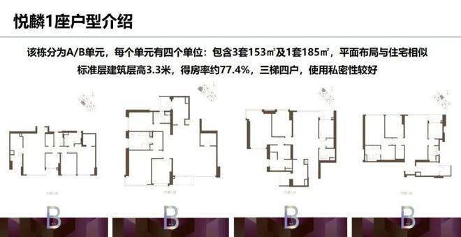 1.TODTOWN天荟 | 悦麟分为两个单元,每个单元三梯四户,主力户型为建面约153~185㎡行政公馆,层高约3.3米,得房率高达约77%,这点非常难得!
