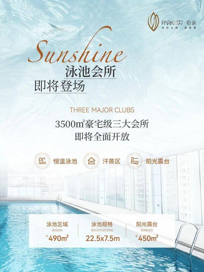 而如今,即将登场的Sunshine泳池会所也已准备就绪,阳光、水波与通透的空间相映,还有池畔露台和汗蒸房,这一切只为兑现您关于度假般日常的所有想象。