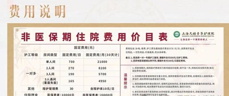 老年护理床位272张,长期收住失智失能,长期卧床、生活不能自理的患者:各类疾病术后需要康复护理的患者:各类患有慢性疾病需要长期医疗照护的患者:认知障碍、肢体障碍需康复者:疾病终末期需安宁疗护者。院内设VIP间双人间、三人间、三人通间多等级护理病房,病房内配有适老化家具、家电、独立卫生间,24小时热水中央空调,呼叫系统,提供1对1、1对2、1对3、1对6等多人的生活需求和医疗护理服务,