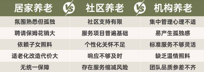 “构建居家为基础、社区为依托、机构为充分支撑、医养相结合的养老服务体系"是中国养老的顶层设计:“9073“模式(90%居、7%社区、3% 机构)是具体的实践模型。居家养老让长者在熟悉的环境中养老;社区养老为长者提供日间照料和活动服务;机构养老提供更专业的照护服务。三种模式各有以上优势,同时亦有单一式不足之处: