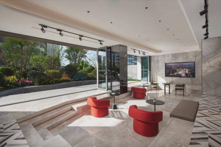 约9米超高挑空大堂:会客休息区分立礼宾台两侧,艺术作品萦绕四周,使每个置身于此的人都能拥有酒店级的尊贵感受;公区集合多位艺术家为TODTOWN天荟|悦麟度身创作的多维艺术品,包括环境音乐、环境香氛、雕塑、油画等,前卫的设计感和高品质的呈现力,营造出多重感官享受的艺术享受。