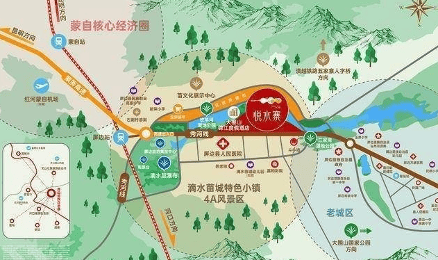 【区位】新区核心重镇 未来价值高地-项目位于屏边门户——国家4A级景区“滴水苗城”核心位置,同时也是屏边最重要文化组成部分“一府八寨”之一。