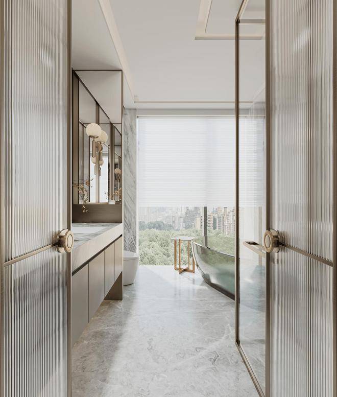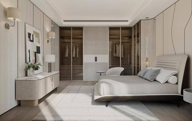 The bedroom continues the tone of the whole space, curved warm color leather hard bag, creating an elegant and calm space atmosphere. The natural neutral color is embellished with metal strips, echoing the designer's consistent artistic fashion.