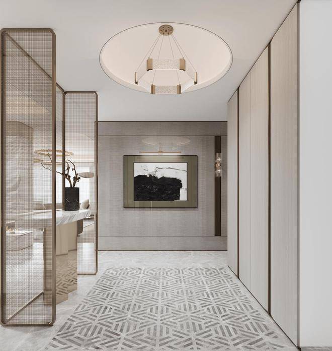 户内玄关通过极具艺术性的玄关台对户外带来一定的视觉屏障,透光不透人的意境,营造雅致优美的意境,演绎豪宅主人的文化内涵与艺术修养。