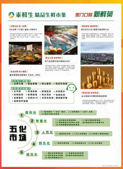 业态分布:进口水产海鲜;精品水产;综合加工区;蔬菜区;豆制品;光禽区;面发;粮油;调味品;鲜肉区;黑猪肉;精品牛羊肉;品牌熟食;卤味小吃;水果;花卉;早餐美食