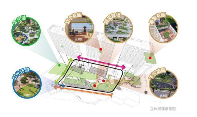 社区内约35%的绿化率创造了近70%的垂直花园景观空间,打造了集“下沉庭院、社区五感花园、屋顶聚场、退台花园、空中花园、康复花园”于一体的4重、7处花园的垂直景观,为长者提供了一个充满生机与活力的居住环境。
