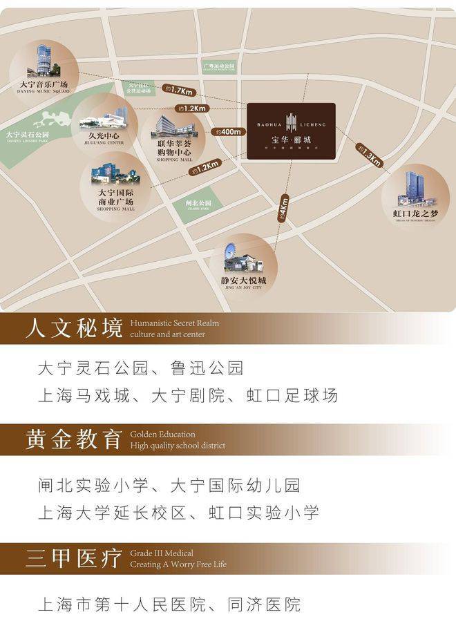 商业配套:百联莘荟购物中心、久光中心、大宁国际商业广场约1.3km 虹口龙之梦、大宁音乐广场、静安大悦城