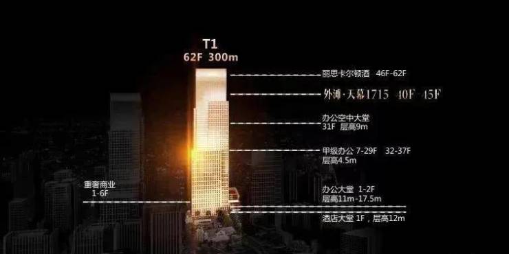 T1 -300米超高层塔楼上部46-62层为五星级酒店(丽思卡尔顿)、38,40-45层行政公馆,中部7-37层为甲级办公,底部为商业及大堂。