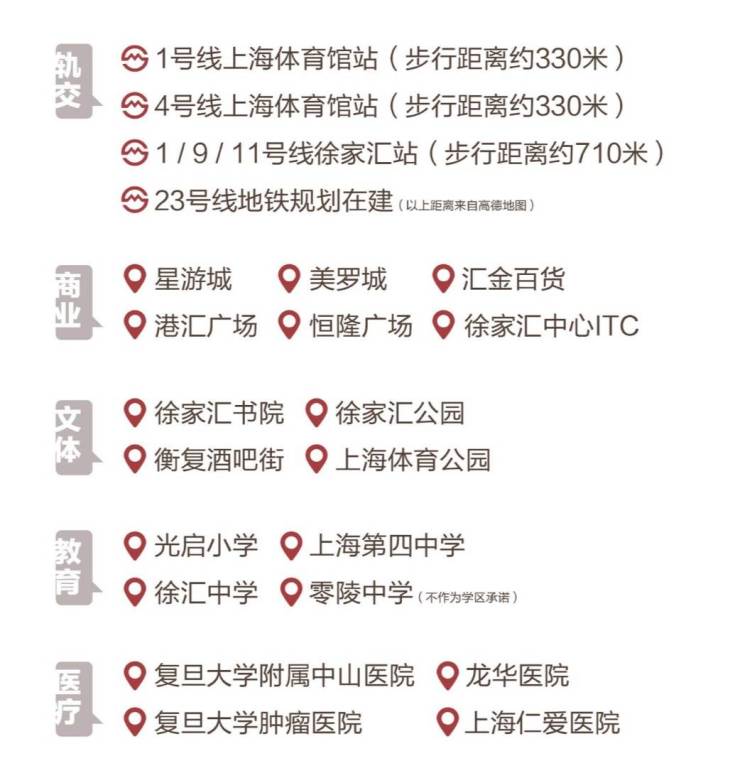 距离1/4号线上海体育馆300米,距离1/9/11号线徐家汇站700米,23号线地铁规划在建(以上距离来自高德地图)