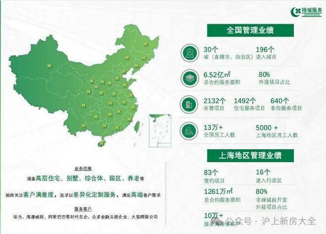 绿城物业在上海地区服务类型项目涵盖别墅,住宅,写字楼,综合体等,其中不仅包括黄浦湾,玫瑰园,融创·玉兰花园等上海地区知名度较高的各类高端住宅,还承接了BHC中环中心,绿城浙铁·长风中心等商业,城市综合体。