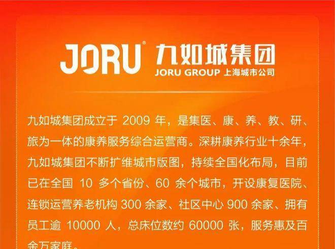 目前,九如城已在 全国10多个省份、60余个城市开设康复医院、连锁运营养老机构300余家、社区中心900余家,员工总数超过10000人,总床位数约60000张,服务惠及百余万家庭。