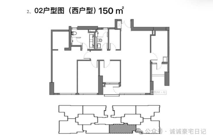 标准层建筑层高3.3米,得房率约77.4%,三梯四户,使用私密性较好。