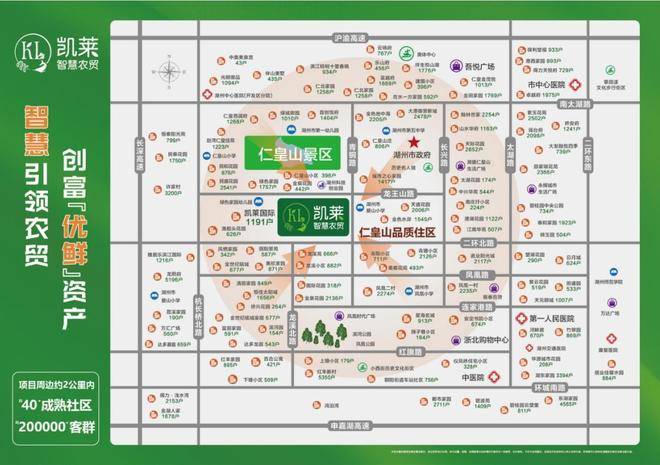 凯莱国际智慧农贸市场,项目位于二环北路,青铜路交叉口。项目所在仁皇山板块是湖州市区核心位置,政府大力发展的核心区域。项目2公里范围内40多个高档小区,约20万人口,项目旁边还有多个学校和大型企业以及商场,例如:湖州市爱山小学,仁皇山小学,湖州市第一幼儿园,湖州市第五中学,绿色家园幼儿园,湖州市凤凰小学,湖州市政府,银泰百货等等!都是固定的消费群体!