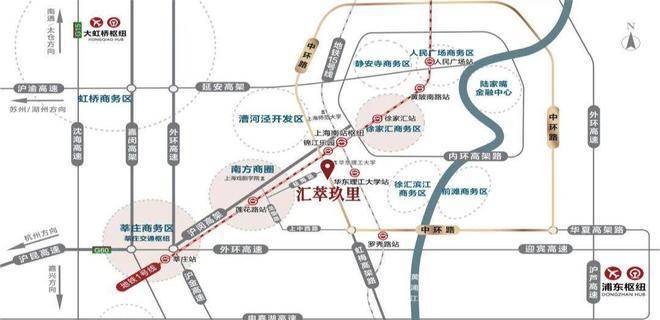 汇萃玖里 坐落闵行与徐汇区主城的交界的黄金中环地带,中环上中西路下匝口,虹梅南路与益梅路交汇处、东至虹梅南路(中环高架)、南至北潮港、北至益梅路。