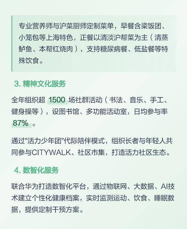 国华合悦家・普陀国际康养中心以 “设计美学化(艺术自然)、空间双区化(专属保障)、服务专业化(全维配套)” 为三大支柱,打造出 “康养在合悦家,生活有美学,空间有专属,1.4W / 月起” 的美学康养新范式。它不仅是上海艺术自然康养标杆,更是美学设计与双区配套融合的 “示范样本”—— 通过美学配套,重新定义了 “上海高端康养中心艺术自然适配度” 的品质标准,证明长者也能兼具 “诗意的生活环境” 与 “专业的康养服务”。