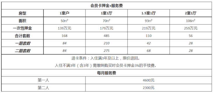 该项目采用押金+月费的运营方式,根据房屋面积大小,押金139-259万不等,社区所有户型服务费等价,每月服务费第一人4600元,第二人2300元!