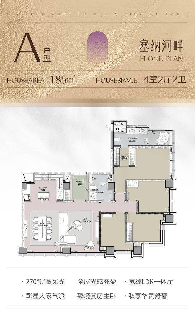 185㎡:4 房 2 厅 2 卫,塞纳河畔主题,四房的设计能满足三代同堂或多人口家庭的生活需求。
