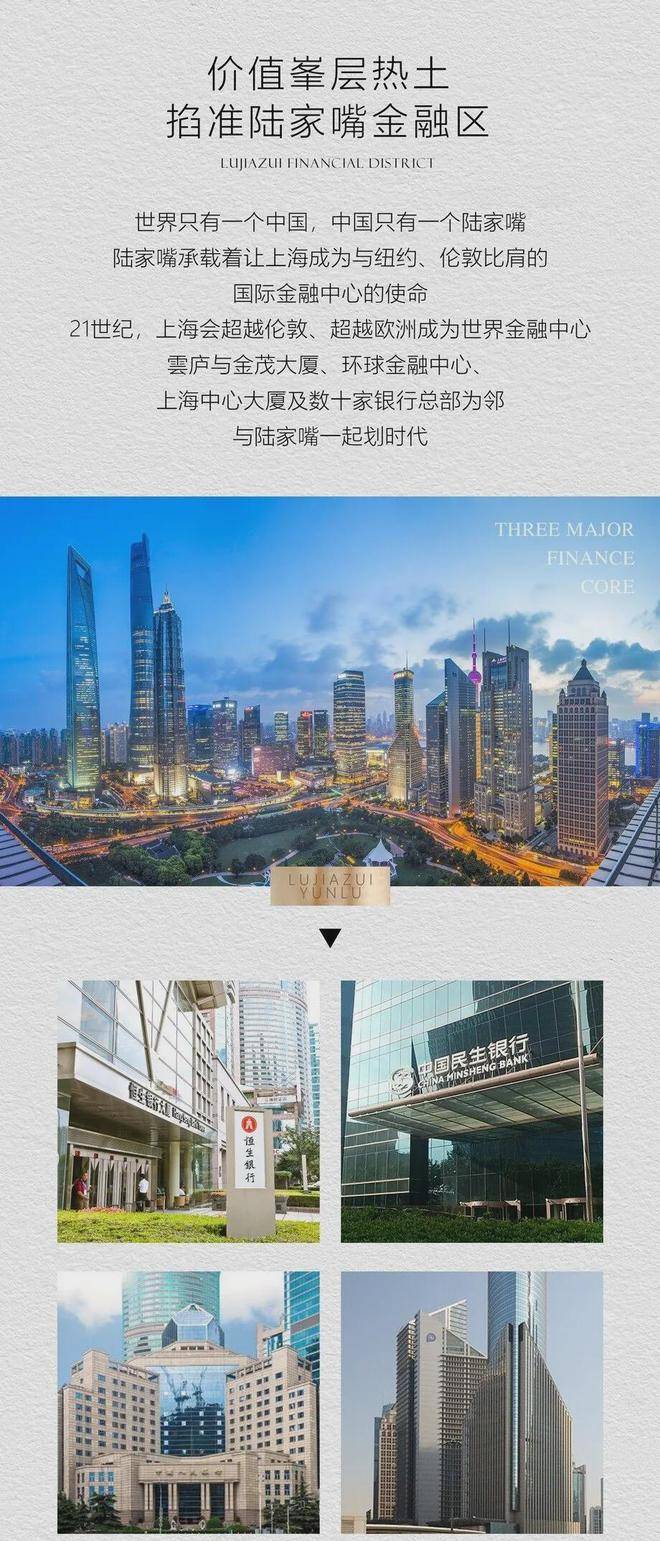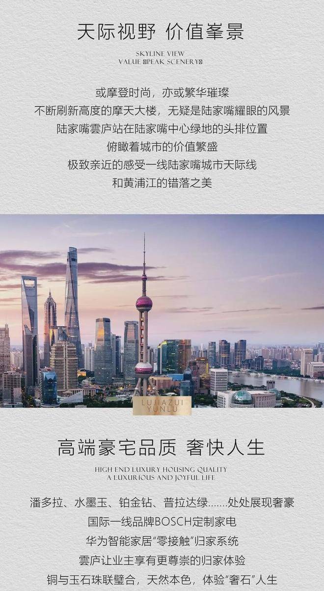 一个永不过时的地段与顶级企业家为邻,入驻上流圈层。陆家嘴核心 CBD,汇集 115 家跨国公司总部,340家全球 500 强企业,6000 多家中外金融机构,约 60 万 +高精尖人才,是城市的塔尖。豪宅云集,圈层进阶。毗邻汤臣一品、财富海景壹号、丽景汇、滨江凯旋门等豪宅。
