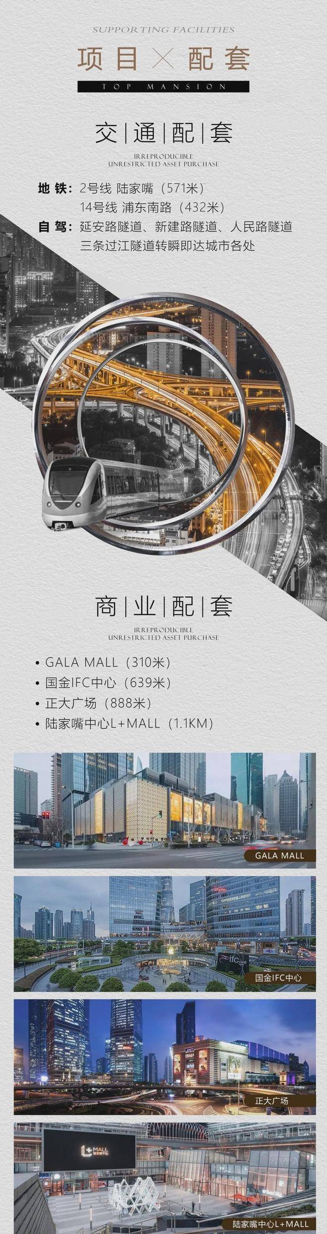 交通方面:双轨三隧+城市主干道与众多公交线路畅达全城、三大国际交通枢纽簇拥。2 号线( 陆家嘴站)、14 号线( 浦东南路站)双轨交换乘;