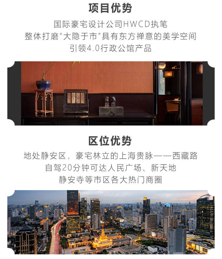 项目优势:国际豪宅设计公司HWCD执笔,整体打磨“大隐于市”具有东方禅意的美学空间,引领4.0行政公馆产品。◇ 区位优势:地处静安区,毗邻豪宅林立的上海贵脉——西藏路,自驾20分钟可达人民广场、新天地、静安寺等市区各大热门商圈。