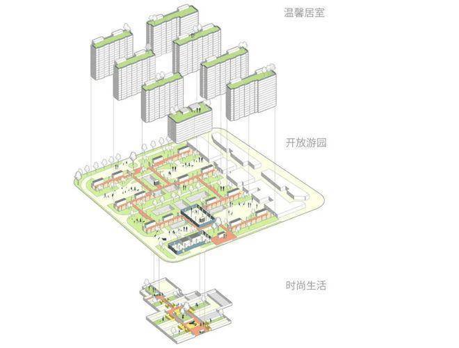 设计团队以多重层次逛起来的开放游园为理念,通过礼仪主轴营造多进中式空间礼序,联通社区入口、风雨连廊和架空层在园区内部设计了完整的晴雨动线, 打造功能与景观兼备的“大孩子乐园”、氛围热闹的地下活力商街和光线充足的下沉庭院。打破了传统养老社区的闭塞感,使其成为最能体现上海长者 专属时尚格调的活跃社区。