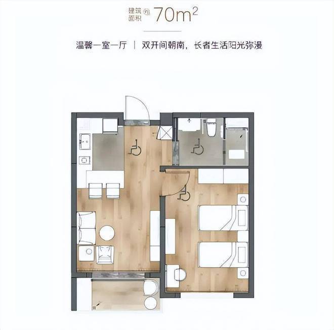 路劲•隽芳华中活力公寓户户朝南布局,共有四种房型可选择,分别是50m²、70m² 、 93m²的一室一厅和 106m²的两室一厅产品,为独居长者、夫妻长者提供不同的选择;护理院以50m²的开间为主。