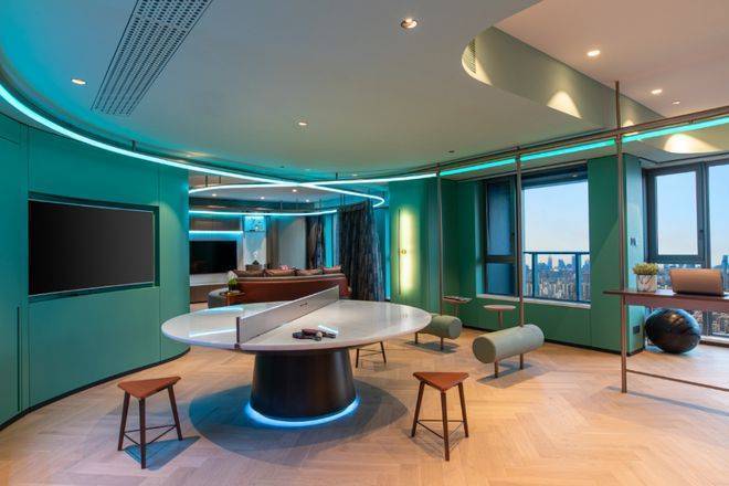 还有吧台、休闲洽谈区、共享会议和健身等功能区,是一个适合交友、会客、休憩、工作、读书、赏景的多功能空间.处处可见的时尚元素,符合当下年轻一代喜好。