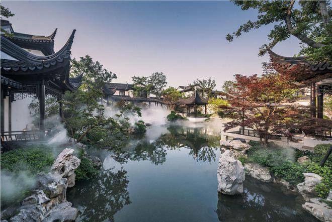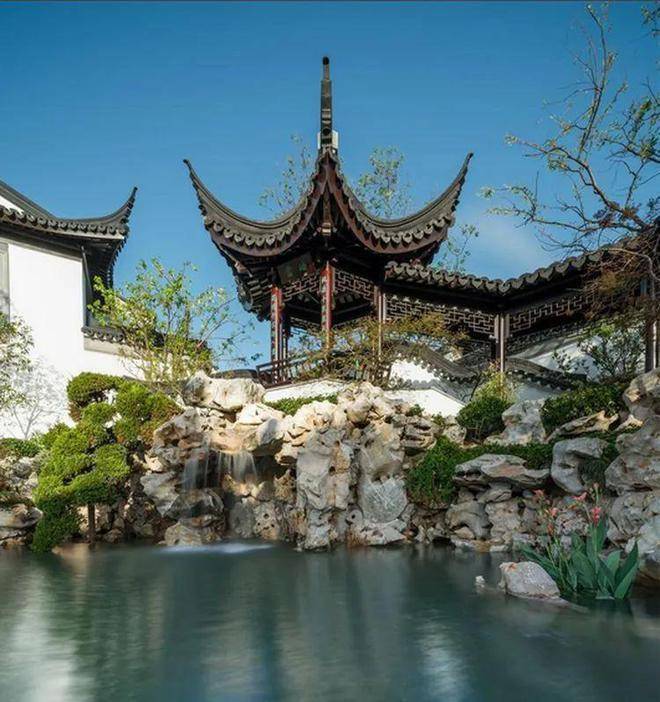 中式园林是最纯粹最理想的精神皈依之所。 进入园林庭院,古朴有致, 瘦漏透皱的太湖石下一方清泉涵韵其间,低头有池水如镜,抬头有瀑布如练,“ 水积必然龙有穴 ”,富贵因子已然埋藏于此。