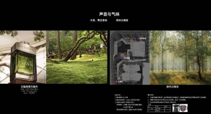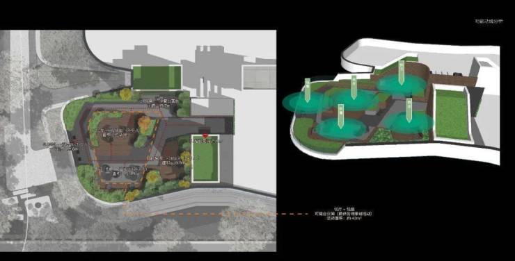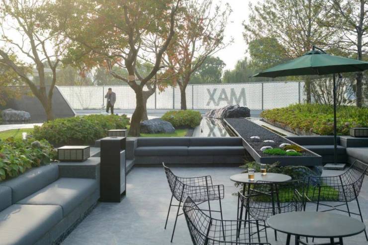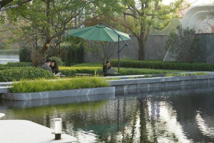 洽谈区掩映在绣球花径与娜塔栎的树影婆娑之中,水系环绕,背靠浓密的植物背景,打造静谧的户外会客空间,将人们带入一个诗意与雅致并存的境地。悬浮于水面的苔藓案台,从远处的水景一直延伸到会客区中央,与潺潺涌泉、天然置石、雅致植物相结合,如精致盆景一般的微观山水,展现山水美学的精髓和品味。一抹浮苔,将会客区的视线引向远处的景观,营造疏朗惬意相互渗透的空间。