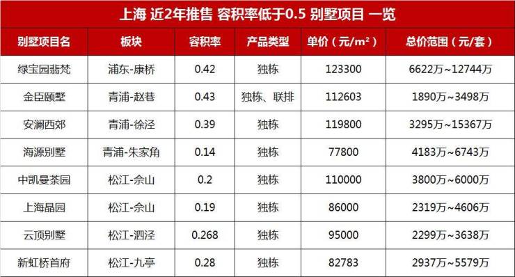放眼全上海,目前容积率低于0.5的在售别墅盘,不超过10个,主力总价3000-6000万,个别房源总价高达1.5亿。