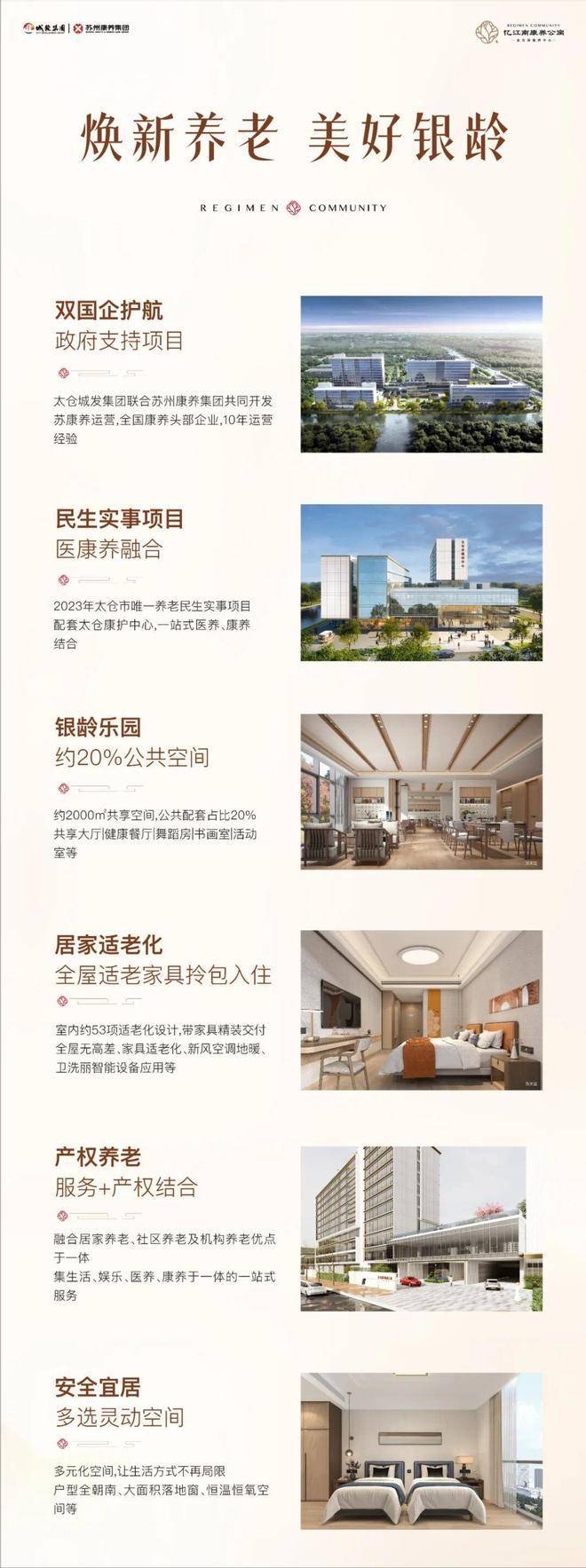 金仓湖康养中心,融合目前已有的养老模式:居家养老、机构养老、社区养老,三位于一体,在原有的养老模式基础上进行升级优化,打造了一种全新的养老模式——产权居家式养老。保证产权所属,满足居家养老的归属感,太仓城发集团负责硬件建设和资源整合,苏州康养集团专注运营服务,双方优势互补。"双国企护航"的运营模式确保了项目品质。