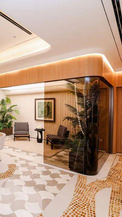 下沉式庭院内,“琉璃光院“主题水景灵动流转,搭配蓝金色调的恒温泳池、私属健身房与行政酒廊,让“海派奢华”不再是想象中的概念,而是可触摸的生活场景。