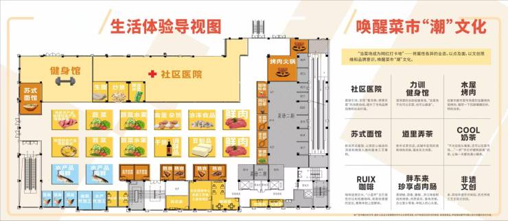 菜场,业态丰富(蔬菜、水果、肉类、海鲜、豆制品、干货、熟食等),形成了良好的商业氛围
