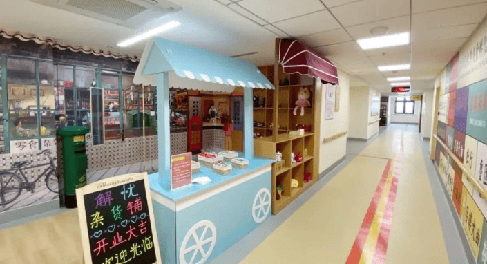 机构内设记忆咖啡馆、艺术工坊、解忧杂货铺等18个主题生活区,以怀旧场景唤醒长者记忆。例如,记忆咖啡馆模拟居家环境,配备老式收音机、缝纫机等物件,鼓励长者担任“店长”或“糕点师”,在角色扮演中维持社会功能;艺术工坊通过绘画、剪纸等创作活动,延缓认知衰退进程。户外空间种植四季花草,形成天然氧吧,五感花园结合药用植物种植,为长者提供多感官刺激环境。