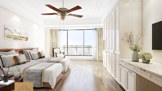 单人间与双人间为主,配备美国约克中央空调、地暖与新风系统,卫生间设置安全起身扶手 、紧急报警拉绳及防滑地砖,智能床垫实时监测心率、呼吸等生命体征,异常情况自动预警至护理站。