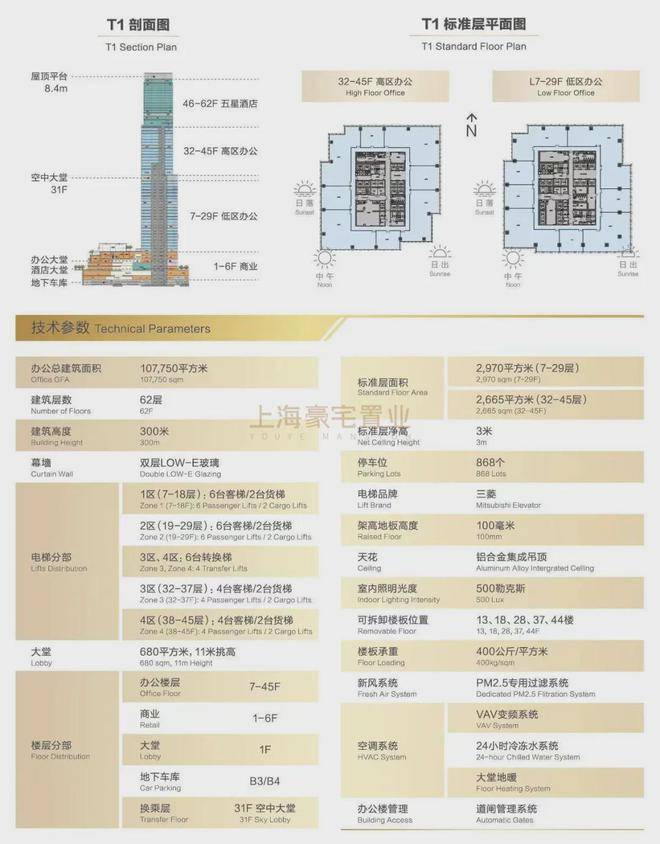【绿地外滩中心】T1超高层国际甲级办公,集商业、酒店及办公于一体,总高度约300米(62F),其中商业总建筑面积约4.2万方,办公总建筑面积约10.75万方,大堂净高约17.5米,标准层高约4.5米,单层面积区间约2000-3000+㎡,主力户型面积约724-799㎡。