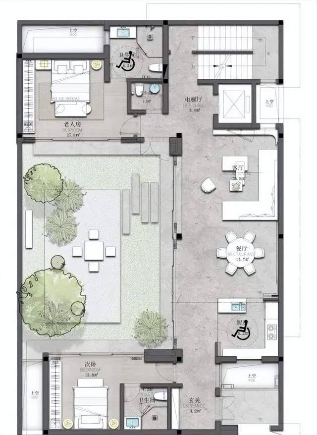 这是一处室内挑高6米的地下室客厅,同时拥有下沉式花园和采光天井。