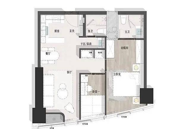 客厅空间舒适,电视背景面完整,可设置闭合式移门,拓展客厅空间的多用性;