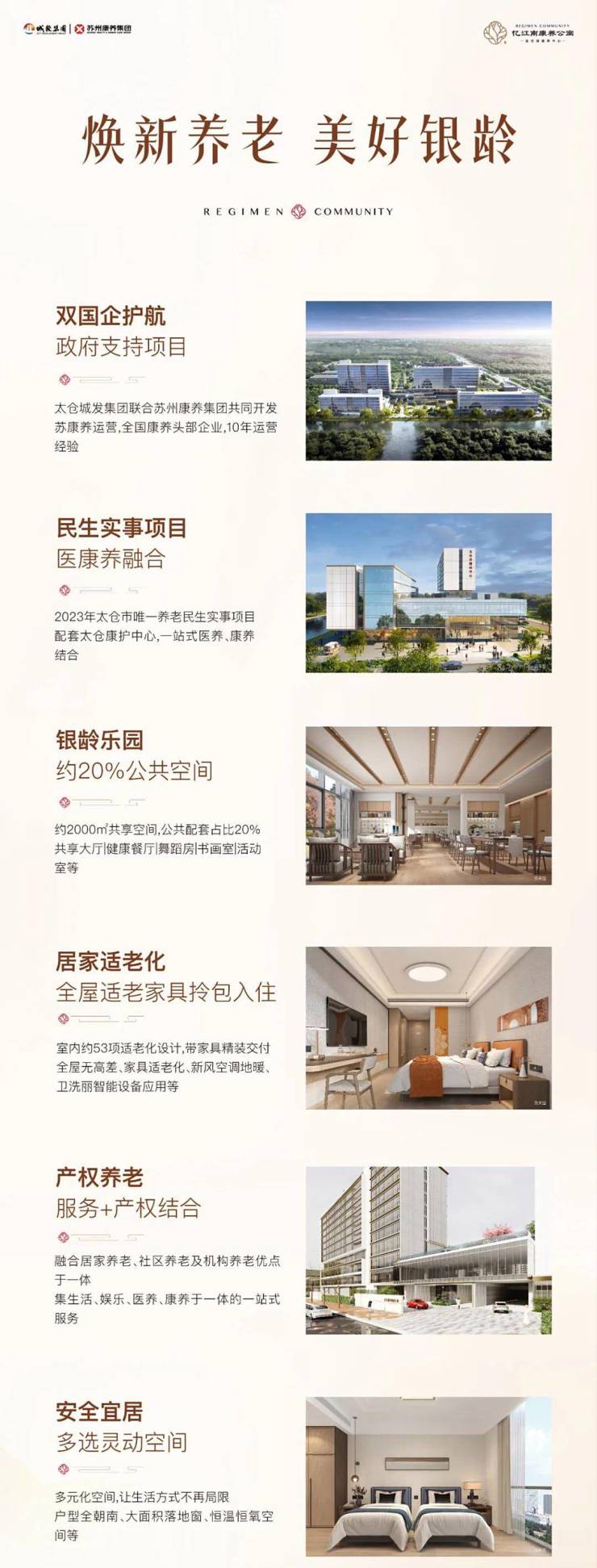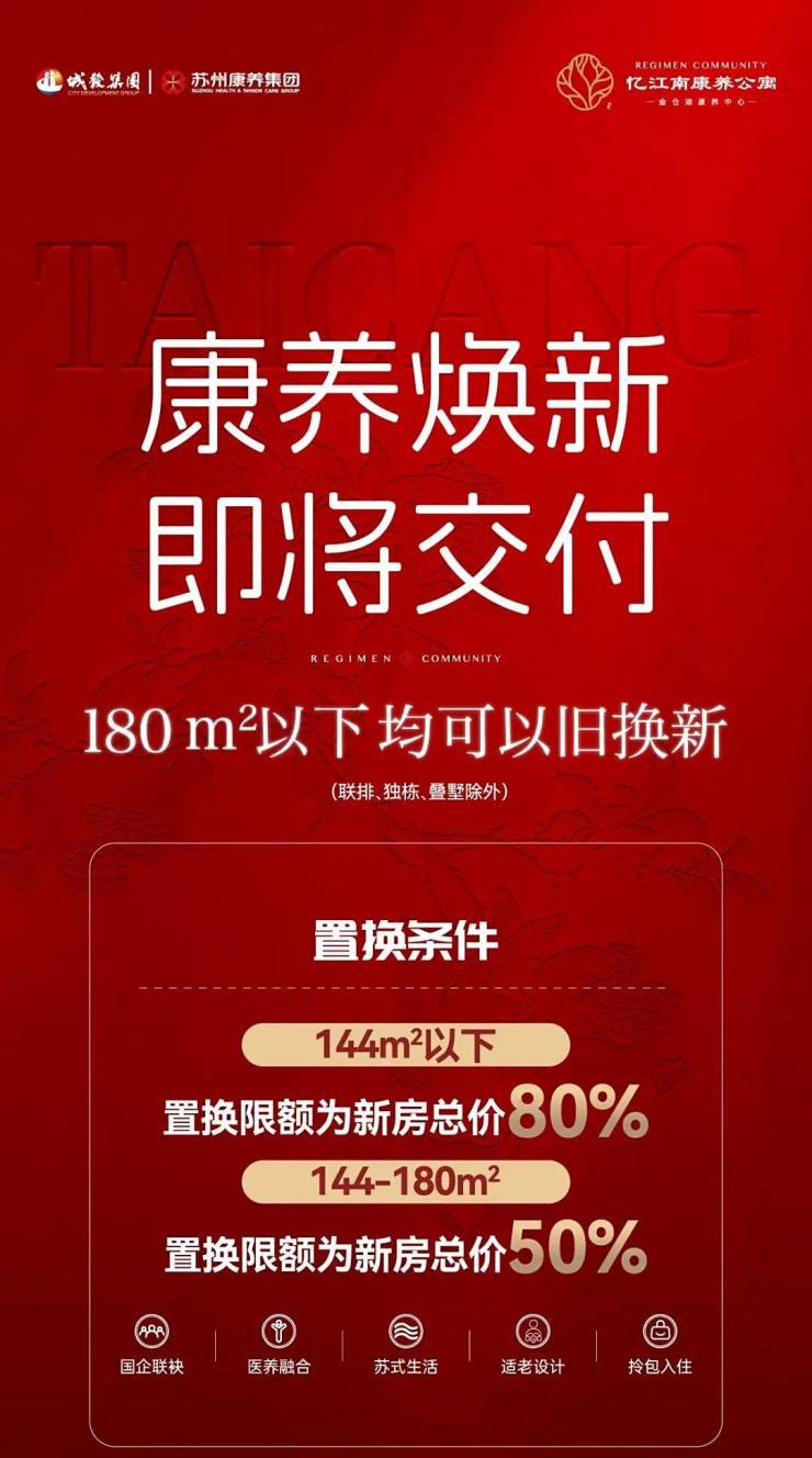 作为2023年太仓唯一健康养老民生实事项目,面对老龄化的社会趋势,旨在满足太仓居民高品质养老住房需求,以居家+机构+社区引领太仓全新的养老模式,同时依托太仓城发集团“以旧换新”政策,为有购房升级需要的长者带来实质性利好,这一政策为长者生活品质改善提供便捷可靠的购房路径。
