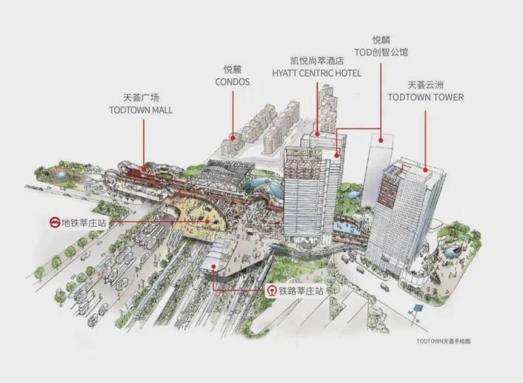 TODTOWN MALL天荟广场、超甲级写字楼TODTOWN TOWER天荟云洲、凯悦尚萃酒店、秘境大宅悦麓、无墙美术馆TODTIME时间廊与创智公馆TODTOWN天荟|悦麟,全维业态于此交织,实现“下楼即享繁华,上楼自在领地”, 物质繁华与精神丰盈共生共荣的理想之境。