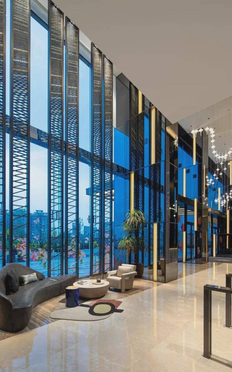 约9米超高挑空大堂:会客休息区分立礼宾台两侧,艺术作品萦绕四周,使每个置身于此的人都能拥有酒店级的尊贵感受;公区集合多位艺术家为TODTOWN天荟|悦麟度身创作的多维艺术品,包括环境音乐、环境香氛、雕塑、油画等,前卫的设计感和高品质的呈现力,营造出多重感官享受的艺术享受。