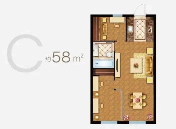 C户型: 58㎡ (两房一厅)
