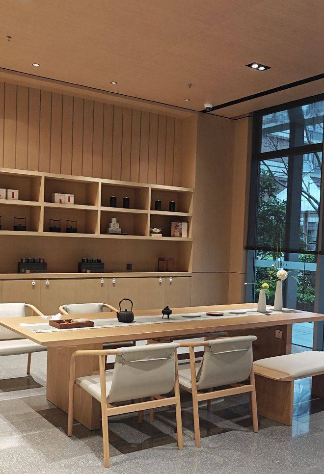 从入口进入,回字型风雨连廊将我们引入会所,沿途新中式风格的庭院景观,让人瞬间心境归于宁静。